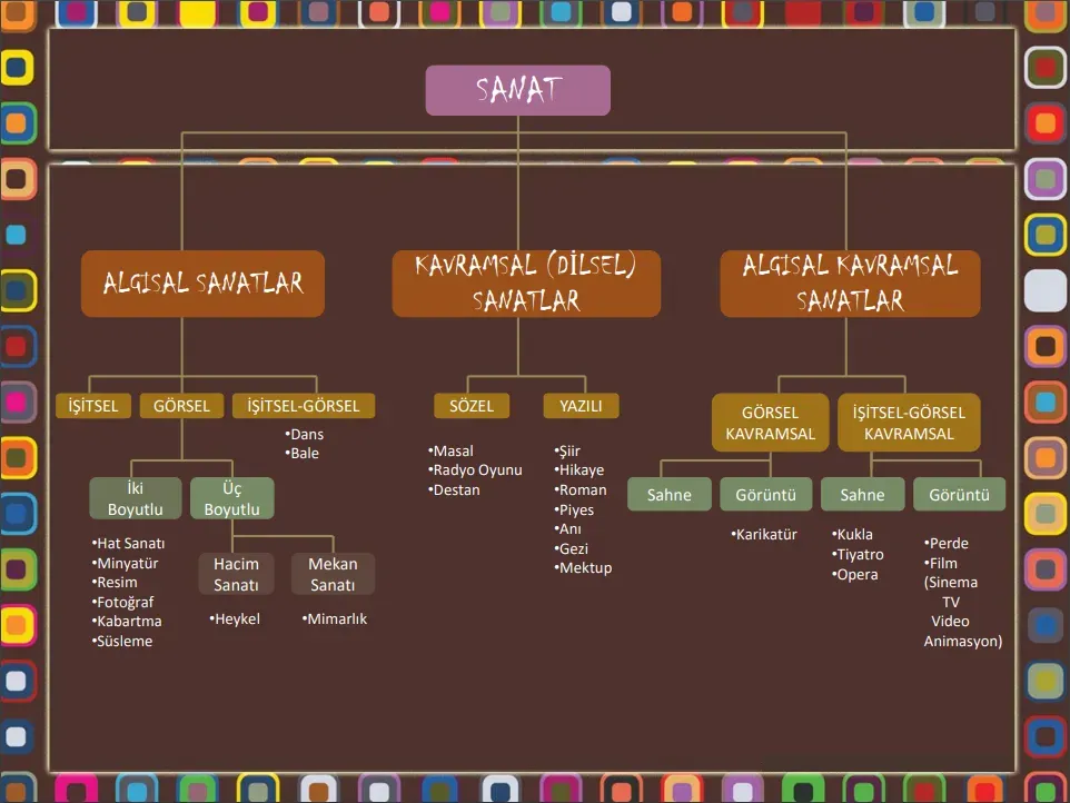 | Sanat Türleri ve Disiplinleri | Görsel sanatlar, işitsel sanatlar, performans sanatları, yazınsal sanatlar ve dijital sanatlar; disiplinler zaman içinde birbirleriyle iç içe geçer ve sınırlar bulanıklaşabilir. |